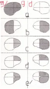 En e une atteinte complète donnera toujours la même hémianopsie ; mais eu égard à la dispersion des radiations à cet endroit une atteinte partielle est plus fréquente donnant lieu à des séquelles variées ; en e’ on montre une atteinte large mais épargnant les fibres d’origine maculaire provoquant une hémianopsie toujours du même type mais avec une épargne maculaire complète, le côté aveugle ne concernant pas la macula.